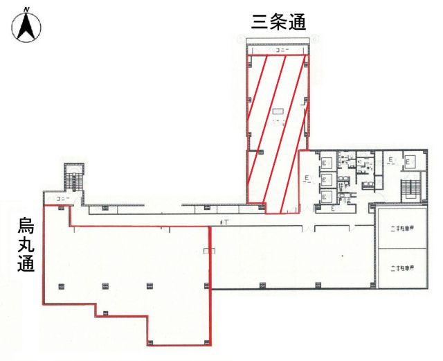 【京都市中京区の貸事務所】 ●烏丸三条角(一部除く)、三条・烏丸に面す● 人気の烏丸三条にある大型オフィスビル。貸事務所は他にもたくさんありますが、大規模ビルは知名度が違います。10階は最上階なので、ビルの奥側ですが圧迫感を感じません。。