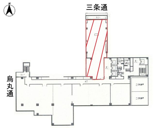 【京都市中京区の貸事務所】 ●烏丸三条角(一部除く)、三条・烏丸に面す● 人気の烏丸三条にある大型オフィスビル。貸事務所は他にもたくさんありますが、大規模ビルは知名度が違います。5階のこの区画は、烏丸通りに面しており、採光量も十分のお部屋です。