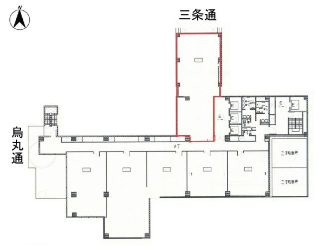 【京都市中京区の貸事務所】 ●烏丸三条角(一部除く)、三条・烏丸に面す● 人気の烏丸三条にある大型オフィスビル。貸事務所は他にもたくさんありますが、大規模ビルは知名度が違います。2階のこの区画は、隣接区画との一括貸しも可能です。